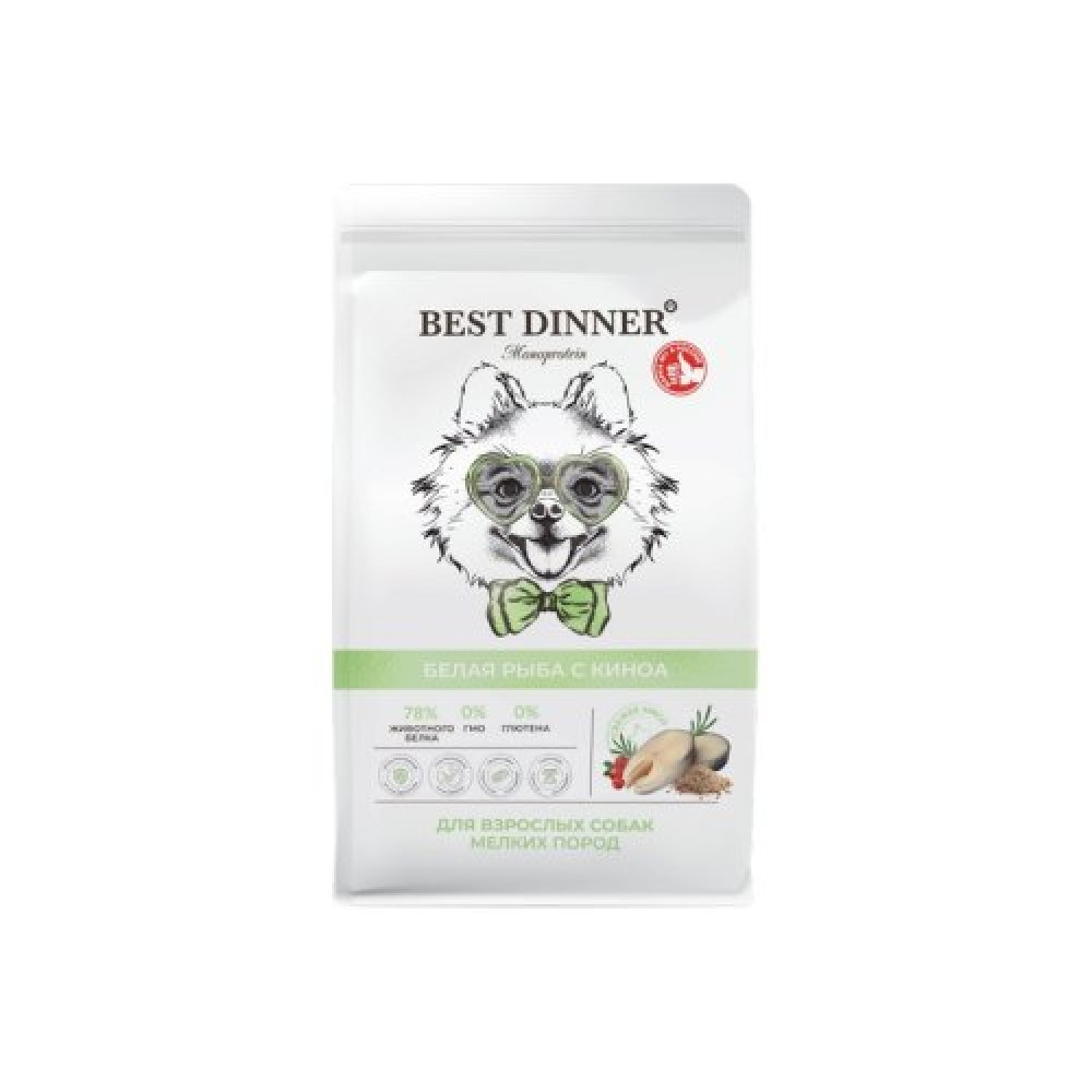 Best Dinner Monoprotein Adult mini FISH & QUINOA для взрослых собак мелких пород склонных к аллергии и проблемам с пищеварением, МОНОПРОТЕИН БЕЛАЯ РЫБА C КИНОА 400 г