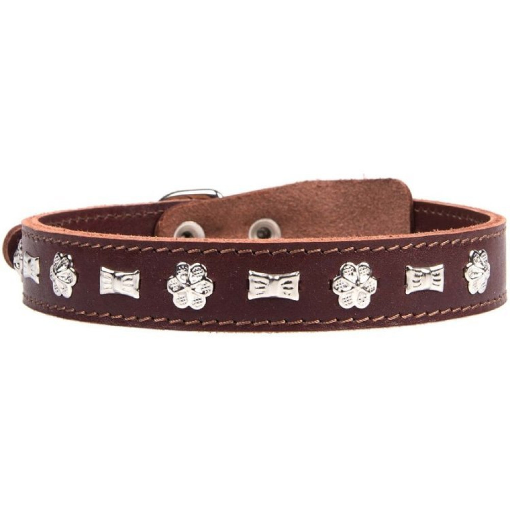 Однослойный ошейник шириной 25 мм с украшением люкс, обхват шеи 39-53 см, натуральная кожа, (возможные варианты украшений - косточки, собачки, лапки, бантики, цветы), артикул О25Л