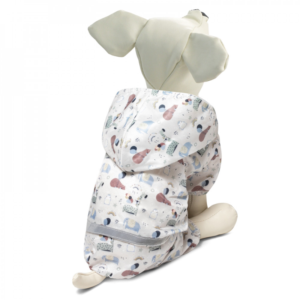 Костюм-дождевик "Сонное царство" - это удобный и функциональный аксессуар для собак, который просто незаменим в дождливую погоду. Изделие защитит шерсть животного от дождя и грязи, а непродуваемая ткань - от сильного ветра. Костюм имеет стильный дизайн, а универсальный фасон не стесняет движений питомца во время прогулки. Особенностью дождевика является светоотражающая лента, идущая по талии изделия, - для повышения безопасности животного на дороге. Дождевик также имеет капюшон и фиксируется при помощи трех заклепок на животе, а на штанинах предусмотрены удобные резинки, препятствующие попаданию грязи и влаги снизу.